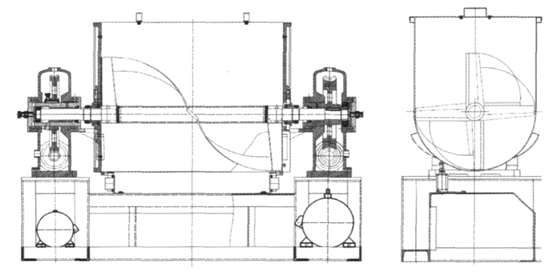 容器回轉(zhuǎn)型的特點是混合機的儲料槽連續(xù)旋轉(zhuǎn),從而導致槽內(nèi)物料混合均勻,此類混合機結(jié)構(gòu)簡單,混合速度慢,混合度較高,混合機內(nèi)部清掃容易。適用于那些物性差異小、流動性好的粉體間的混合,也適用于有磨損性的粉粒體的混合。其結(jié)構(gòu)如圖所示: