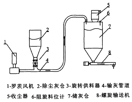 除塵系統(tǒng)手機(jī)的煙塵采用密閉管道正壓稀相輸送方式,將煙塵輸送到只求系統(tǒng)進(jìn)行壓球。采用氣力輸送的優(yōu)點(diǎn)是減少了煙塵的二次倒運(yùn)和因此產(chǎn)生的無(wú)組織排放,實(shí)現(xiàn)了煙塵的長(zhǎng)距離密閉輸送。如下圖: